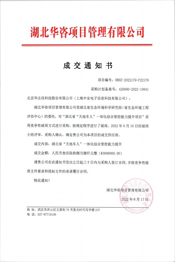 中安科技中標(biāo)湖北生態(tài)環(huán)科學(xué)院“湖北省‘天地車人’一體化綜合管控提升”項目(2022/10/10)